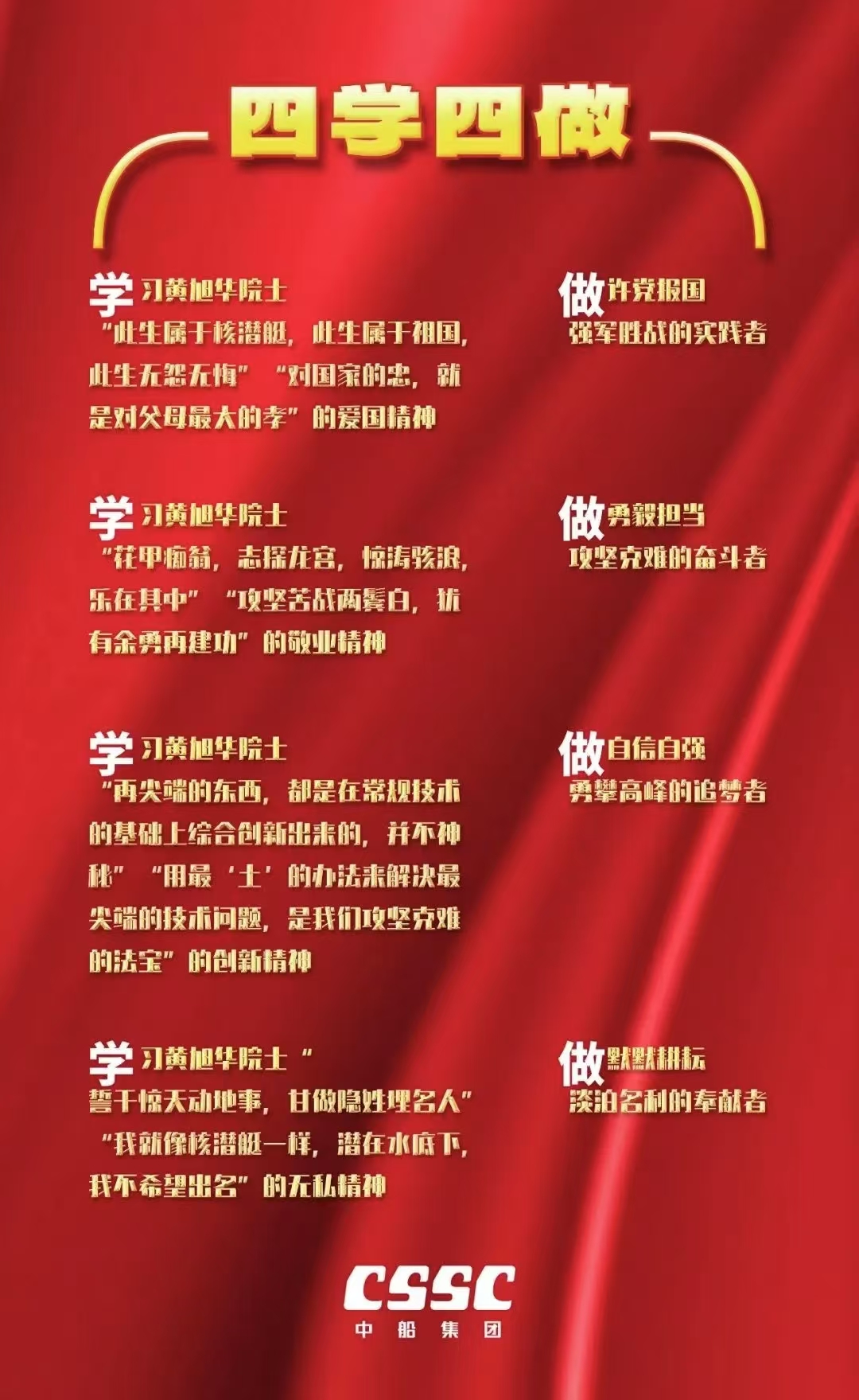 近日,中船集團(tuán)黨組下發(fā)通知,號(hào)召全集團(tuán)深入開(kāi)展黃旭華院士先進(jìn)事跡“四學(xué)四做”活動(dòng)。公司全體員工要深入學(xué)習(xí)宣傳黃旭華院士先進(jìn)事跡、優(yōu)秀品格和優(yōu)良作風(fēng),繼承黃旭華院士遺志,弘揚(yáng)核潛艇精神,賡續(xù)中船文化,在新時(shí)代新征程中,爭(zhēng)做對(duì)黨忠誠(chéng)、對(duì)事業(yè)執(zhí)著的奮進(jìn)中船人,自覺(jué)將個(gè)人奮斗融入到中船集團(tuán)發(fā)展大局中,切實(shí)將學(xué)習(xí)活動(dòng)成效轉(zhuǎn)化為完成全年任務(wù)目標(biāo)、推動(dòng)“十四五”圓滿收官的實(shí)際成效。